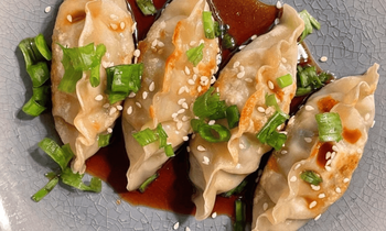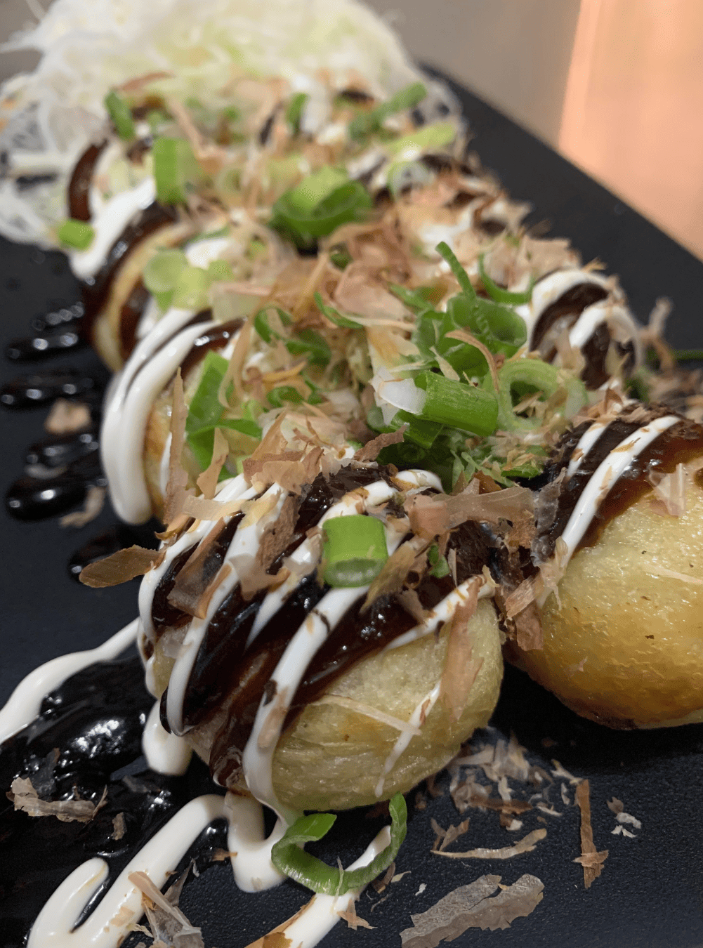 8 bolitas de masa de trigo con pulpo/chorizo/crab stick acompañado con ensalada de repollo. 8 Wheat dough balls with octopus/chorizo/crab stick accompanied with cabbage salad.