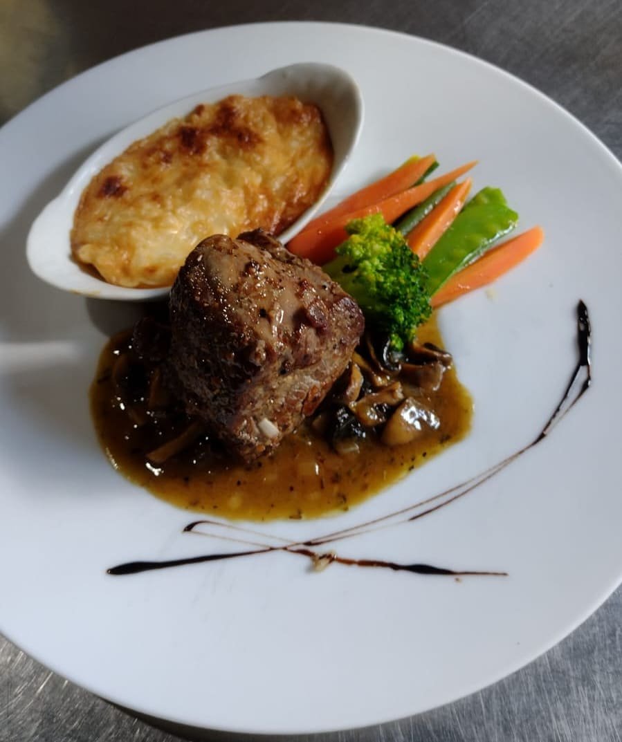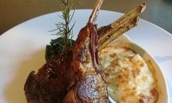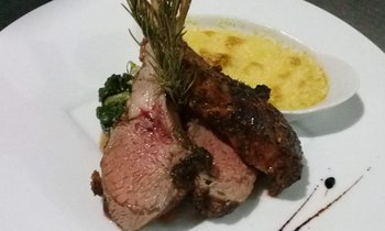 Costillas de cordero romero acompañado con gratin, yuca y vegetales.