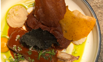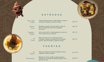 -Tostada Mestizo: Montadito de pixtón, guiso de gallina, mayo de perejil, ensaladilla de aromas y vegetales encurtidos. -Linaje Maya: Tamal de frijoles y cerdo mechado, salsa de patín caramelizado, salpicón de encurtidos y fermentos de la casa, espuma de anona. -El Pepián: Pollo con especies, cremoso de pepián, puré de vegetales y salsa de pepián. -El rellenito: Patacón de plátano, cremoso de queso de cabra, pure de frijol y helado de chocolate.