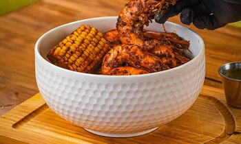 Camarones Cajún, pizzas y hamburguesas.