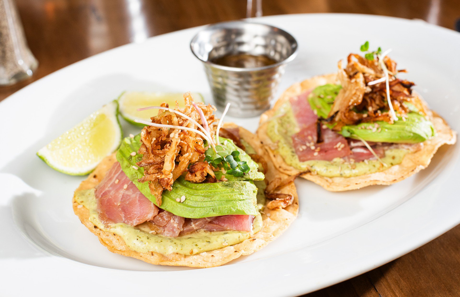 Atún fresco, tostada, mayo, cilantro, aguacate, cebolla crispy y soya cítrica.
