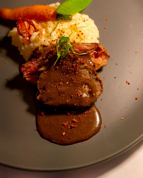 Pato con rub de café y cardamomo con salsa de chocolate y puré de pache.