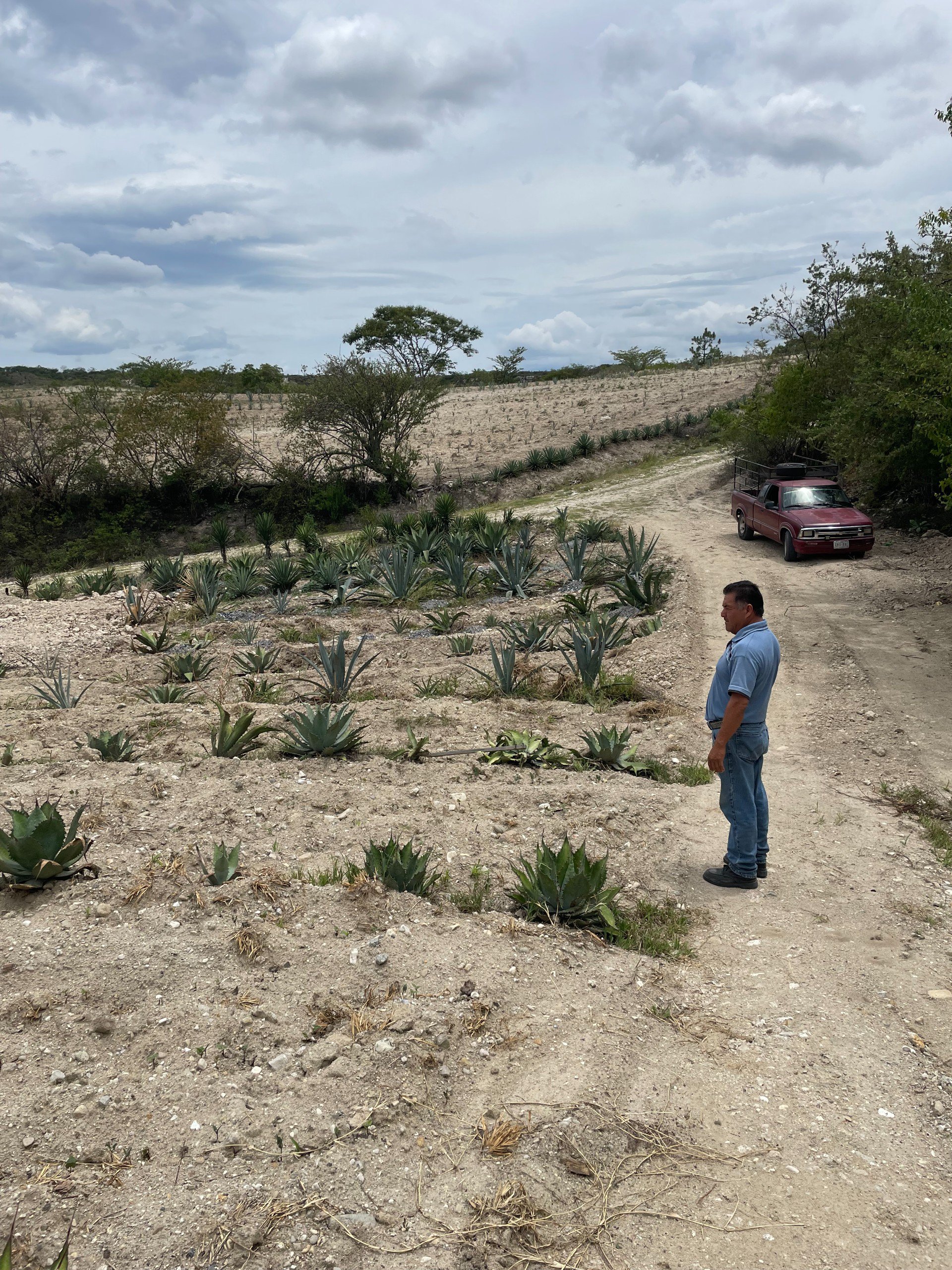 Al día siguiente en el palenque, fuimos a visitar los terrenos que ha adquirido para poder plantar agave, un proyecto que empezará a dar frutos de aquí a… seis años al menos, que es lo mínimo de tiempo que necesita el agave angustifolia - el famoso espadín - para estar en su punto de maduración. Los campos de Agustín no son monocultivos, se pueden observar las diferentes variedades que tiene en un mismo terreno, los árboles que ha dejado para dar sombra, para que la tierra tenga otros nutrientes, para no deforestar. Entre las filas de agave Agustín y Reyna cultivan también maíz, frijol (que de paso ayuda a la tierra porque aporta nitrógeno), calabazas, entre otros. La tierra es aprovechada de la mejor manera ya que no solo cultivan agave, si no también productos que contribuyen a su seguridad alimentaria.