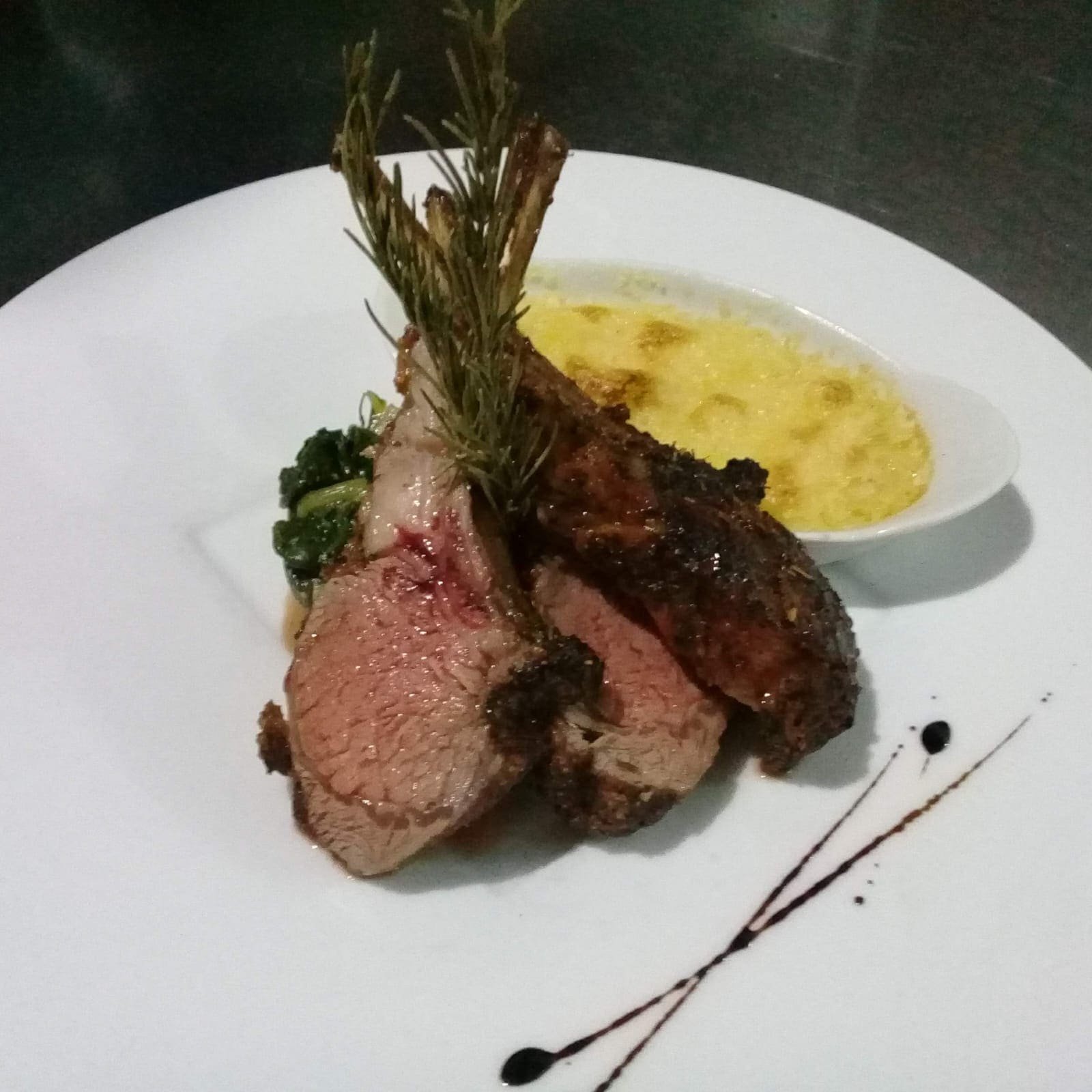 Costillas de cordero romero acompañado con gratin, yuca y vegetales.