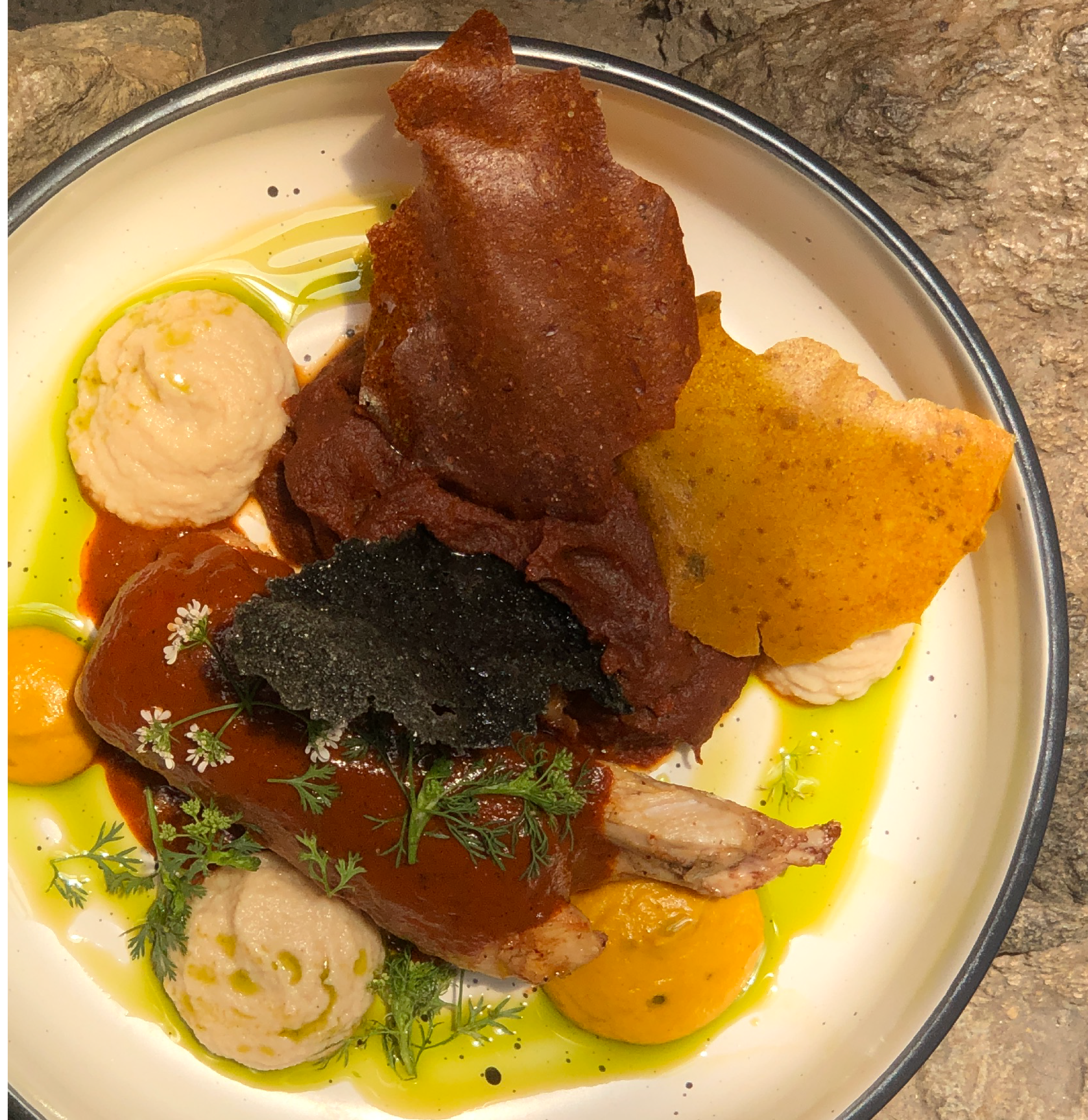 -Tostada Mestizo: Montadito de pixtón, guiso de gallina, mayo de perejil, ensaladilla de aromas y vegetales encurtidos. -Linaje Maya: Tamal de frijoles y cerdo mechado, salsa de patín caramelizado, salpicón de encurtidos y fermentos de la casa, espuma de anona. -El Pepián: Pollo con especies, cremoso de pepián, puré de vegetales y salsa de pepián. -El rellenito: Patacón de plátano, cremoso de queso de cabra, pure de frijol y helado de chocolate.