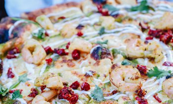 La Mar: Camarones al ajillo salteados con chimichurri de la casa, tomates deshidratados, alfredo cremoso, mozzarella, cilantro y nuestro aderezo ranch casero. Una ola de sabor directo al horno.