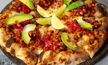 Pizza Al Pastor: Cerdo marinado, piña rostizada, aguacate, cebolla morada encurtida, pico de gallo, mozzarella y un toque de limón. Fusión taquera con alma italiana.