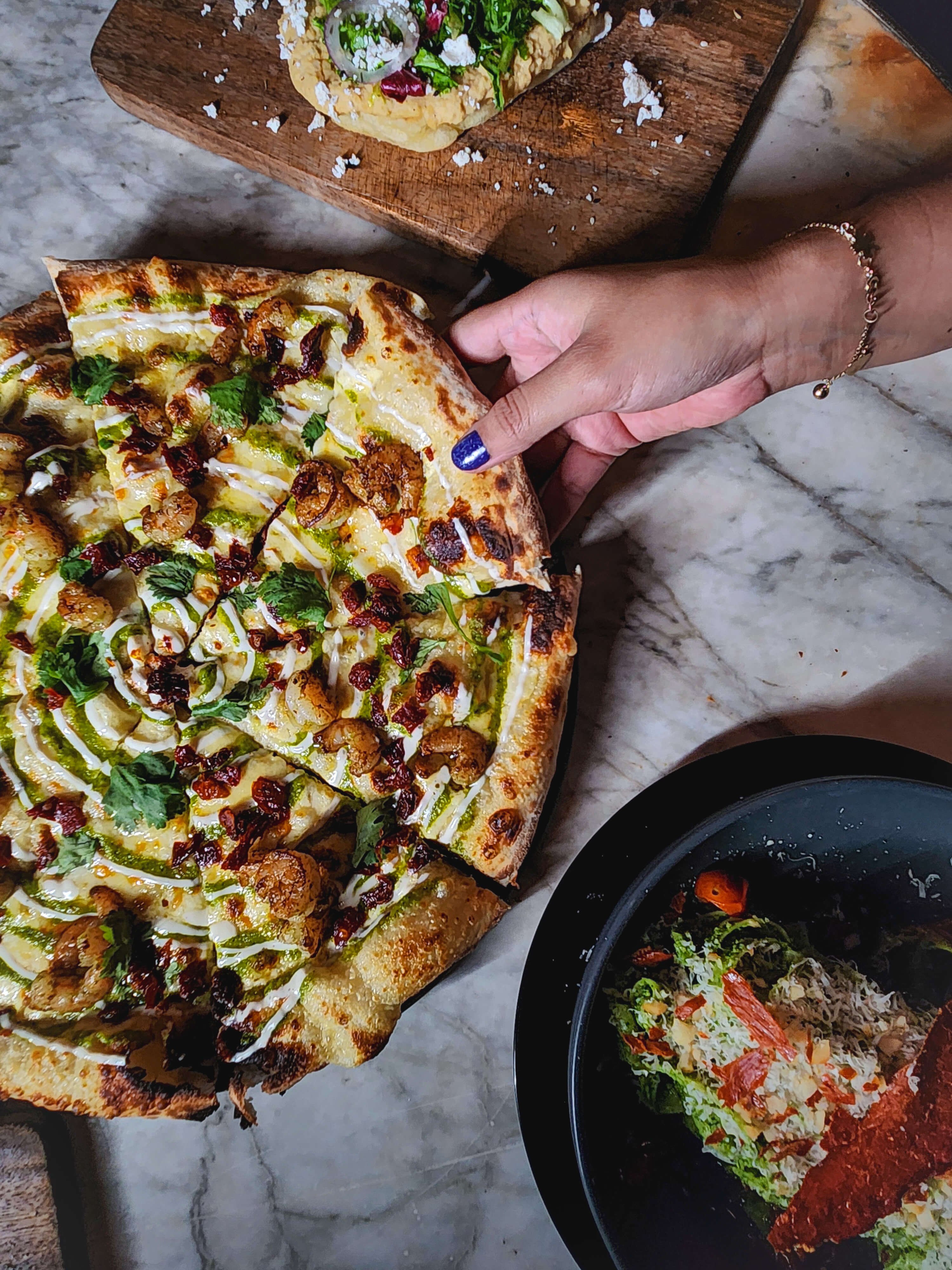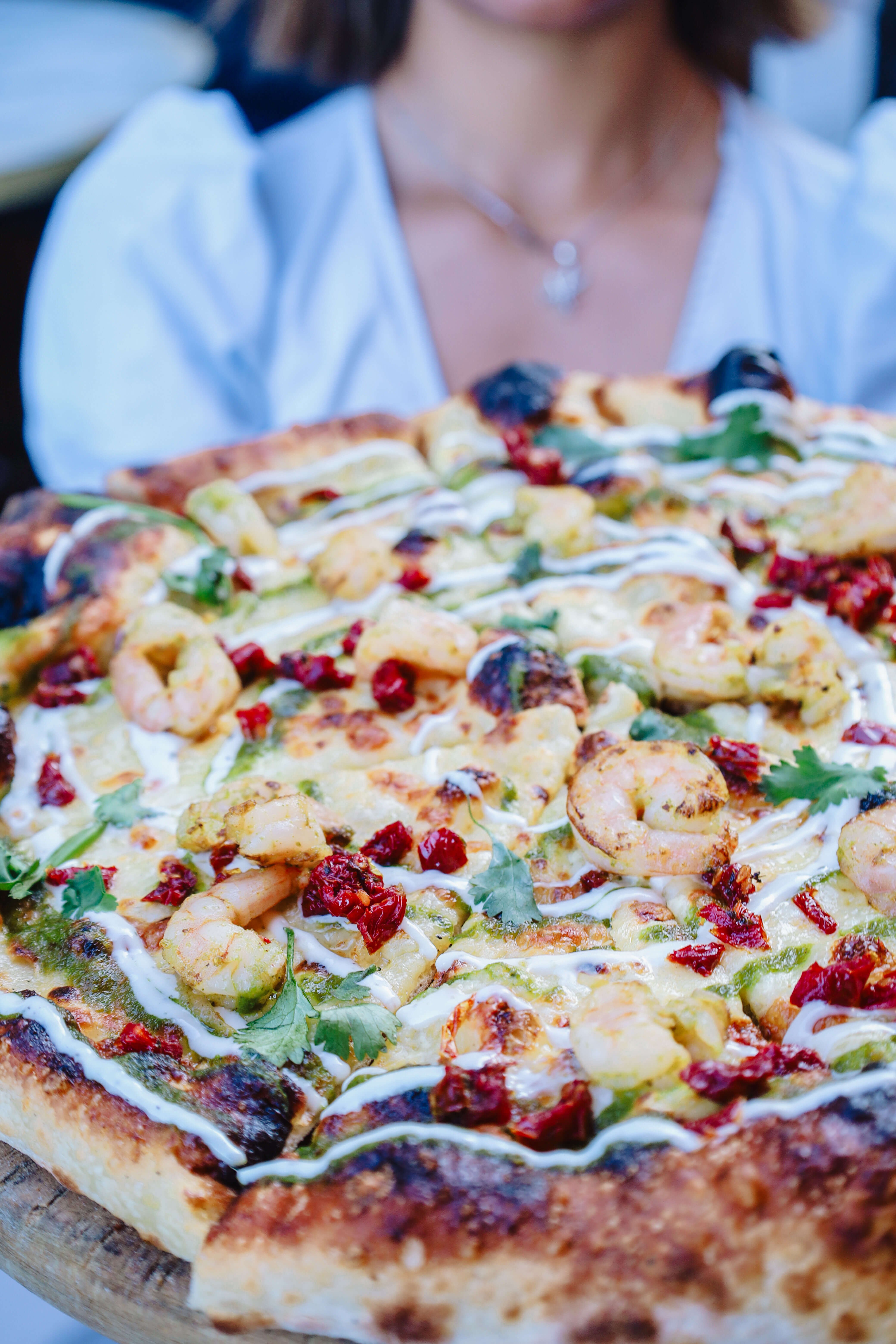 La Mar: Camarones al ajillo salteados con chimichurri de la casa, tomates deshidratados, alfredo cremoso, mozzarella, cilantro y nuestro aderezo ranch casero. Una ola de sabor directo al horno.